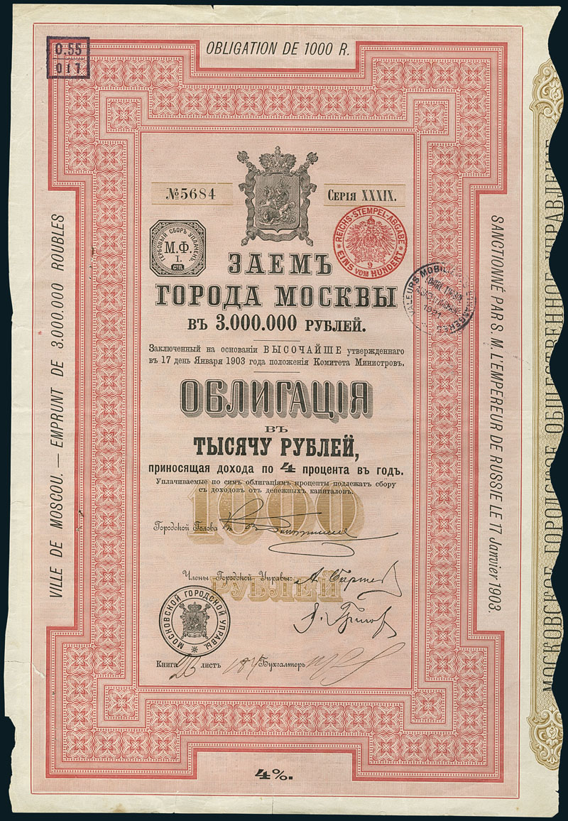 Ville de Moscou. 4% Obligation de 500 R, Serie XXXI, 13.9.1901 SUT 2075b. Nr. 5684. With Coupons 23-40. VF.