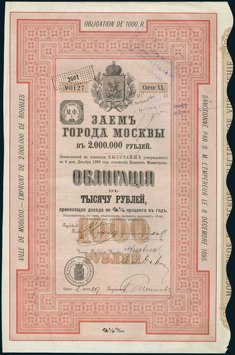 Ville de Moscou. 4½% Obligation de 1'000 R, Serie XX, SUT 2064c, R10. Nr. 0127. VF.