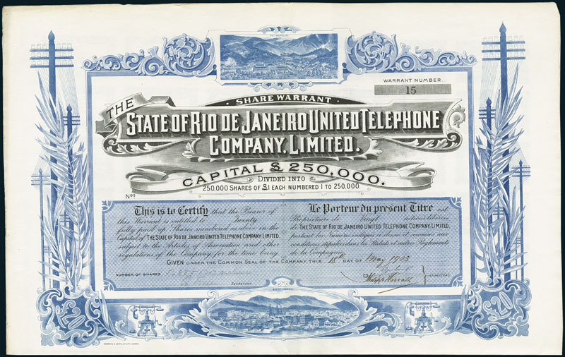 State of Rio de Janeiro United Telephone Company. Certificate 20 Shares. 18. Mai 1903. Nr. 15. Large format. The Rio de Janeiro Telephone Company was founded in 1907 under the laws of the State of Maine, USA. The company owned the entire share capital of the Brazilianische Electricitats-Gesellschaft, a German company, which owned the telephone concession granted by the municipality of Rio de Janeiro. The Rio de Janeiro Telephone Company was dissolved in 1911 when the shares of the Brazilianische Electricitats-Gesellschaft became the property of the Rio de Janeiro Tramway, Light and Power Company. Rare and decorative item, with illustrations of the cities of Petropolis and Rio de Janeiro. EF.
