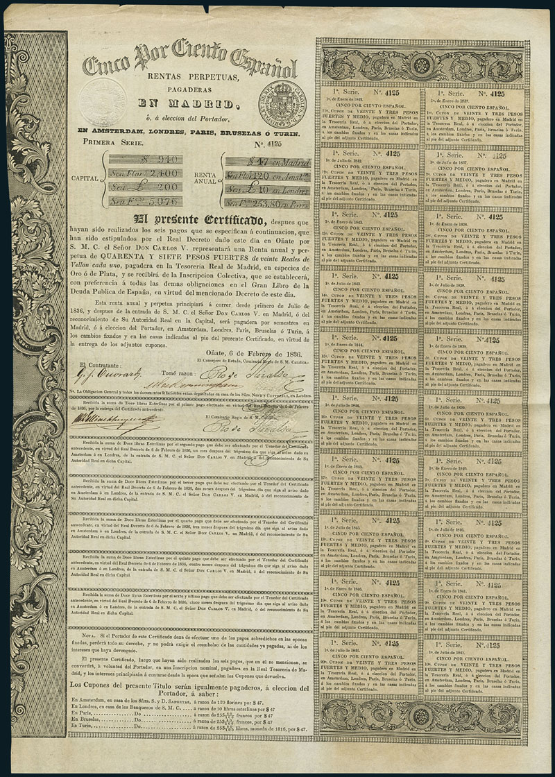 Cinco Por Ciento Español, Perpetual rente, Spanish$ 940 = £200 Primera Serie. Madrid 6. Febrero 1836. Nr. 4125. Small tears. Signed by Gabriel-Julien Ouvrard as El Contrantante. Gabriel-Julien Ouvrard (1770-1846) can be considered as one the biggest and shrewdest speculators in history. He won and lost a vast fortune on multiple occaisons during the turbulent times between the French revolution and Restoration. He first made a fortune through colonial trade and supplying the French Navy, the Spanish fleet and the French army in Italy. In exchange for a cash advance, he received valid obligations including monthly subsidies that Spain had to pay to France in implementing the Treaty of 22 June 1803 and in 1804. He even obtained from Spain its monopoly of trade with Spanish America. In 1809, he was imprisoned for unpaid debt and was released three months later. Believing that only peace could bring maritime economic growth, he tried to negotiate a secret peace with England with the support of Louis Bonaparte and Joseph Fouché, which earned him three years in prison. Ouvrard again played a large role in the economic recovery of France after the fall of the Empire. In 1816, he advised the Prime Minister of Louis XVIII, on a 100 million pension that filled the coffers of the state. His biggest downfall was in 1823, when he financed a further French invasion of Spain. He was never reimbursed, but placed in bankruptcy and later imprisoned for corruption. Again, he lost his entire fortune. Gabriel-Julien Ouvrard died in London in 1846. VF.