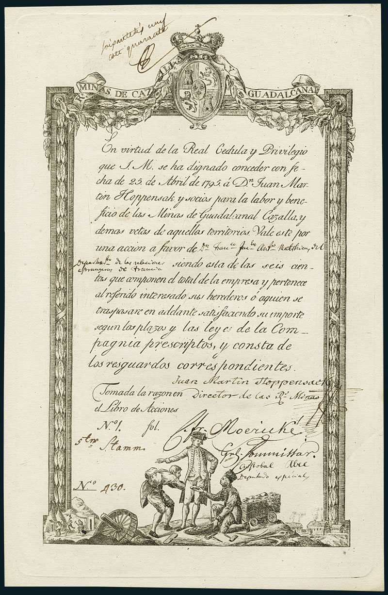 Minas de Guadalcanal Cazalla. Share. 25. April 1795. Nr. 430. Founders Share. Johann Martin Hoppensack was a Saxonian construction engineer. He arrived in the region of Almaden in the south of Spain, where he found many quicksilver mines once operated by the famous Fuggers. They had been abandoned a long time ago due to flooding problems and poor results. Between 1768 and 1774, Hoppensack tried to reactivate these mines. Superb copper engraving on laid paper. On reverse translation into German. Original signature of Martin Hoppensack. UNC.