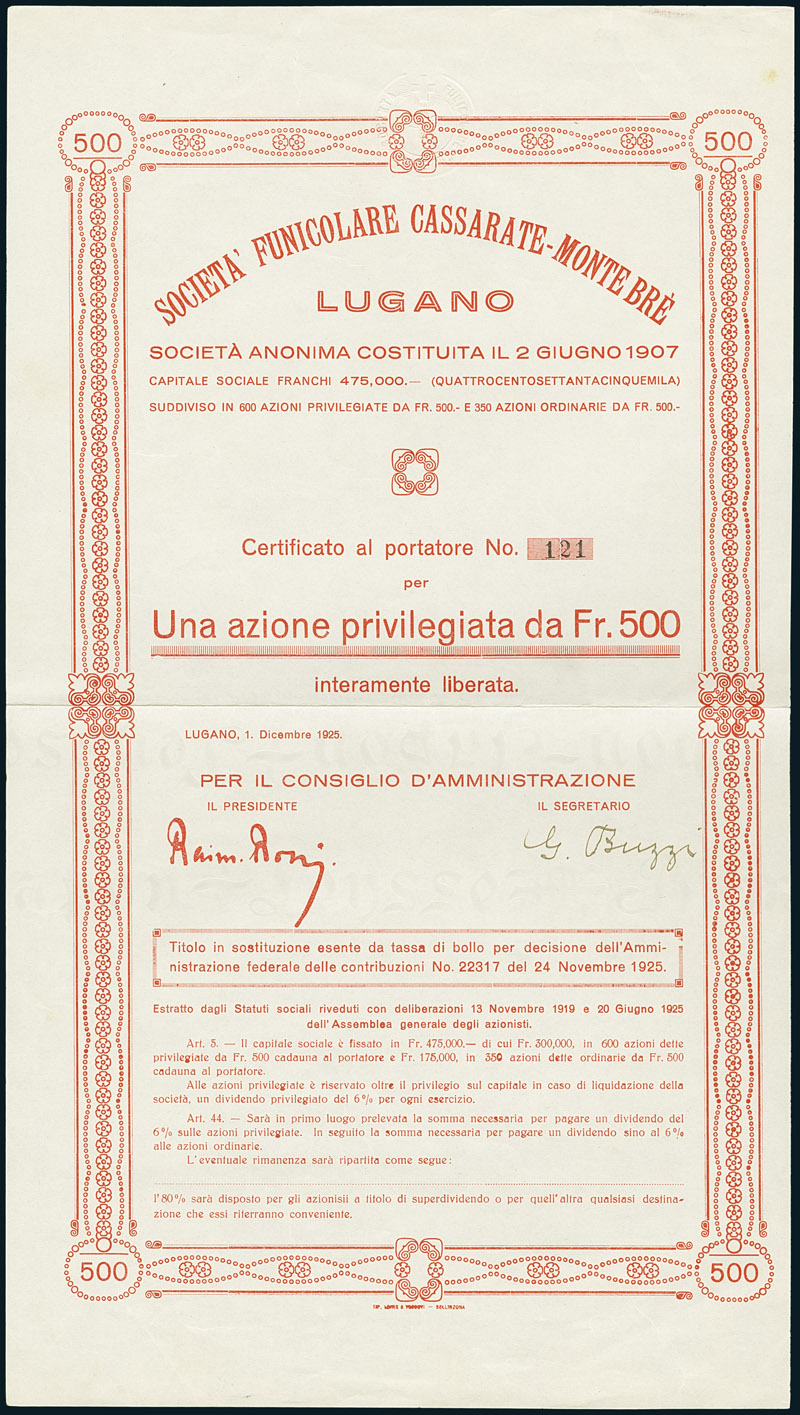 Cassarate-Monte Bré, Societá Funicolare. Azione privilegiata Fr. 500, Lugano 1 Dicembre 1925 Nr. 121. The Funicolare Cassarate - Monte Bré links Lugano with the summit of Monte Bré. The concession for the construction of the funicular was granted in 1905. The lower section opened in 1908. The upper section followed in 1912. Share still valid with Coupons 38-60. EF.