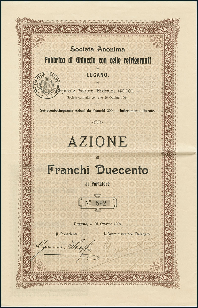 Fabbrica di Ghiaccio con celle refrigeranti. Azione Fr. 200. Lugano, 26 Ottobre 1904. Nr. 592. The company was an ice factory that also let freezer compartment. With print signature of Guiseppe Stoffel as Presidente. He was member of swiss parlament and president of the banca cantonale when it collapsed in 1914. Not in Hiwepa catalogue. EF.