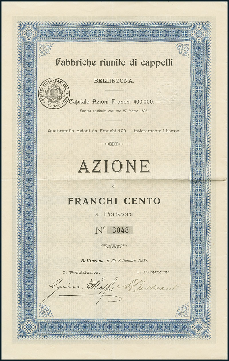 Fabbriche riunite di cappelli. Azione Fr. 100. Bellinzona, 30 Settembre 1905. This hat factory never made a profit and was one of the reason of the financial difficulties of the Banca populare ticinese. With print signature Guiseppe Stoffel as Presidente. He was member of swiss parlament and president of the Banca Cantonale when it collapsed in 1914. EF.