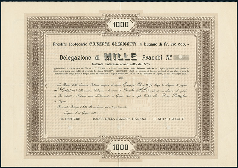 Hotel Lloyd Lugano - Giuseppe Clericetti. Prestito Ipotecario 5%, Fr. 1'000 Franken. Lugano, 1. Giugno 1908. Unissued. Banca della Svizzera Italiana financed the Hotel Lloyd National in Lugano. EF.