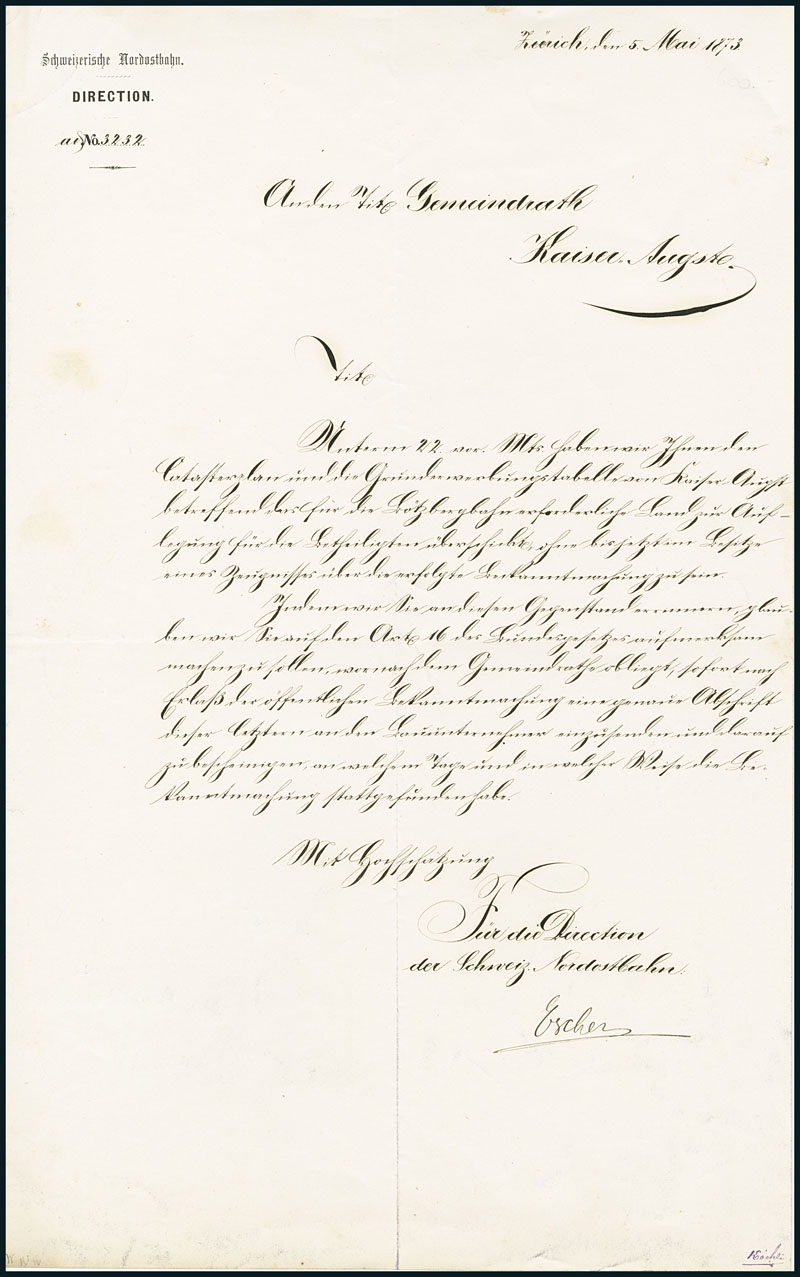 Alfred Escher - Schweizerische Nordostbahn-Gesellschaft. Anschreiben an den Gemeinderat von Kaiser Augst vom 5. Mai 1873. Die 1853 in Zürich gegründete NOB war mit einem Streckennetz von 853 km bis zum Zusammenschluss der Westschweizer Bahnen zur Jura-Simplon-Bahn 1891 die grösste Schweizerische Bahngesellschaft. Im Jahre 1902 wurde die Gesellschaft verstaatlicht und in die heutige SBB integriert. Originalunterschrift von Alfred Escher. EF.