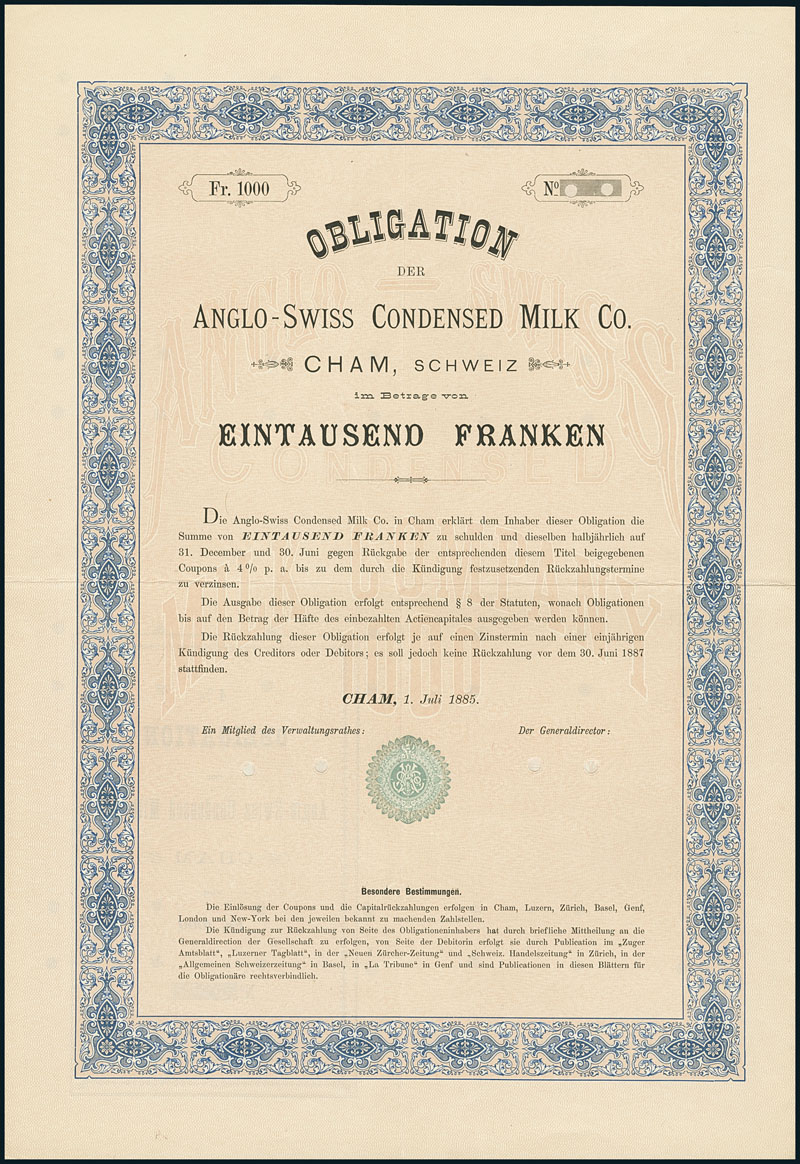 Anglo-Swiss Condensed Milk Company. Cham Switzerland. 4% Obligation über F 1'000. Cham, 1. Juli 1885. Blau/rosa. Blankett. Die Gesellschaft wurde 1866 als erste Kondensmilchfirma Europas gegründet. Die amerikanischen Gebrüder George und Charles Page brachten die Gesellschaft nach anfänglichen Schwierigkeiten zum Erfolg. Seit 1878 stand das Unternehmen in harter Konkurrenz mit der Henri Nestlé S.A. mit welcher sie dann 1905 zur Nestlé & Anglo Swiss Condensed Milk Co. (1977 Nestlé) fusionierte. Auf Coupons Faksimile-Unterschrift von Georg H. Page. EF.