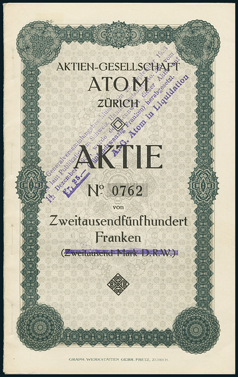 Atom Zürich. Namenaktie über 2'500 Franken. Zürich, 30. April 1916. Nr. 762. Die Gesellschaft wurde 1916 gegründet. Deren Zweck hatte - trotz des Namens - nichts mit Kernkraftwerken zu tun. Dieser war die Verwertung und Weiterentwicklung eines "Trocknungsverfahrens" für die Konserven-Industrie (Nahrungs- und Genussmittel). 1923 wurde der Nennwert auf 25 Franken reduziert und die Liquidation eingeleitet. Kleinformatiger Titel. Ausgestellt auf Schöffer & Co in Rotterdam. VF.