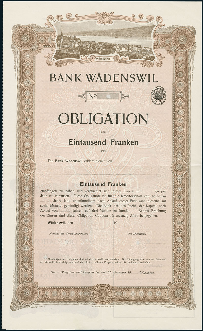 Bank in Wädenswil. Obligation über 1'000 Franken. Wädenswil, 1900er Jahre. Rosa/rotbraun. Blankett. Die Gründung erfolgte 1863. Hatte Einnehmereien in Schönenberg und Hütten. Die Aktien waren an der Zürcher Börse kotiert. Die Gesellschaft war u.a. an der Tuchfabrik Pfenninger und der Tuchfabrik Wädenswil beteiligt. Hochformatig mit grosser Abbildung von Wädenswil. EF.
