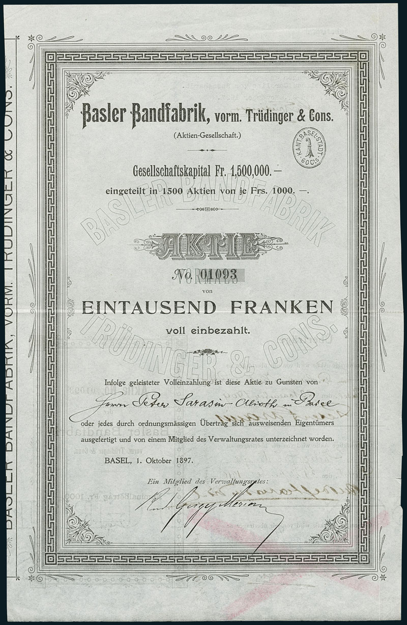 Basler Bandfabrik, vorm. Trüdinger & Cons. AG. Aktie, Fr. 1000, Basel, 1. Oktober 1897. Nr. 01093. Der Titel trägt die Unterschrift von Johann Rudolf Geigy-Merian als Mitglied des Verwaltungsrates. Der Kaufmann Philipp Trüdinger aus Nördlingen (Bayern) war seit 1851 Angestellter in der Bandfabrik von Karl Sarasin-Sauvain. 1855 gründete er mit der Unterstützung seines Chefs eine eigene Firma, die Salathé, Trüdinger & Co. In den 70er Jahren beteiligte sich Johann Rudolf Geigy-Merian an diesem Unternehmen, das 1887 in eine Kollektivgesellschaft umgewandelt wurde. Im Jahr 1897 wurde diese in eine Aktiengesellschaft mit einem Kapital von Fr. 1.5 Mio. (eingeteilt in 1500 Aktien zu je Fr. 1000) umgewandelt. Die Gesellschaft produzierte neben Basel und Liestal auch in Bregenz, wo der österreichische und osteuropäische Markt bearbeitet wurde. Grosse Verluste in den zwanziger Jahren bedeuteten das faktische Ende der Gesellschaft, die jedoch erst 1980 gelöscht wurde. Johann Rudolf Geigy-Merian (1830-1917) war eine der wichtigsten Industriellen in der Geschichte der Kunstfarbenproduktion. 1857 gründete er ein Unternehmen zur Herstellung von synthetischem Fuchsin. 1888 entwickelte er ein einfaches Verfahren zur Indigosynthese. 1901 wurde seine Firma in eine Aktiengesellschaft umgewandelt und 1914 in J.R. Geigy AG umbenannt. 1970 fusioniert sie mit der Firma Ciba zur Ciba-Geigy, welche nach einer weiteren Fusion mit Sandoz 1996 zur heutigen Novartis wird. Geigy war auch Mitbegründer der Basler Handelsbank und deren Verwaltungsratspräsident, Verwaltungsrat der Gotthardbahn und der Schweizerischen Centralbahn. 1879–87 war er ausserdem Mitglied des Nationalrats, wo er nach Alfred Eschers Tod als eine der massgebenden Personen in Wirtschaftsfragen galt. Die vorliegende Aktie trägt rückseitig die Unterschrift seines Sohnes Johann Rudolf Geigy (1902-1995), Tropenmediziner und zwei Mal diejenige von Philipp Trüdinger. Die Aktie ist auf den Bandfabrikanten Peter Sarasin-Alioth (1870-1955) ausgestellt und von diesem ebenfalls rückseitig unterschrieben. Aktien dieser Gesellschaft tauchten vor vielen Jahren auf, nur wenige tragen die Geigy-Unterschrift als Verwaltungsratsmitglied. Ein äusserst wichtiger Titel in der Schweizer Industriegeschichte und sicherlich einer der bedeutendsten Schweizer Autographen. EF.