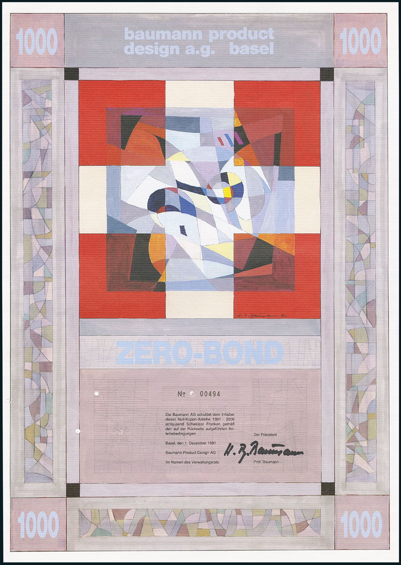 Baumann Product-Design AG Basel. Zero-Bond über 1'000 Franken. Basel, 1. Dezember 1991. Nr. 494. Den Entwurf dieser Obligation schuf der Berliner Kunstprofessor Baumann. EF.