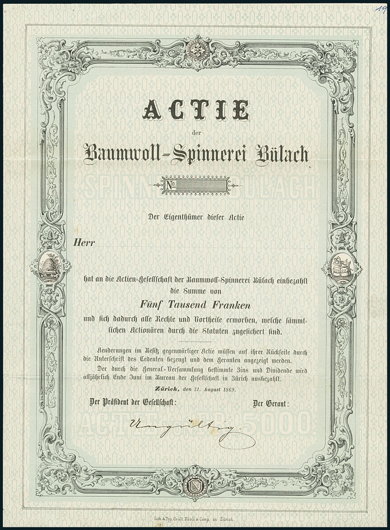 Baumwoll-Spinnerei Bülach. Namenaktie über 5'000 Franken. Zürich, 31. August 1869. Grün. Blankett. Äusserst selten. EF.