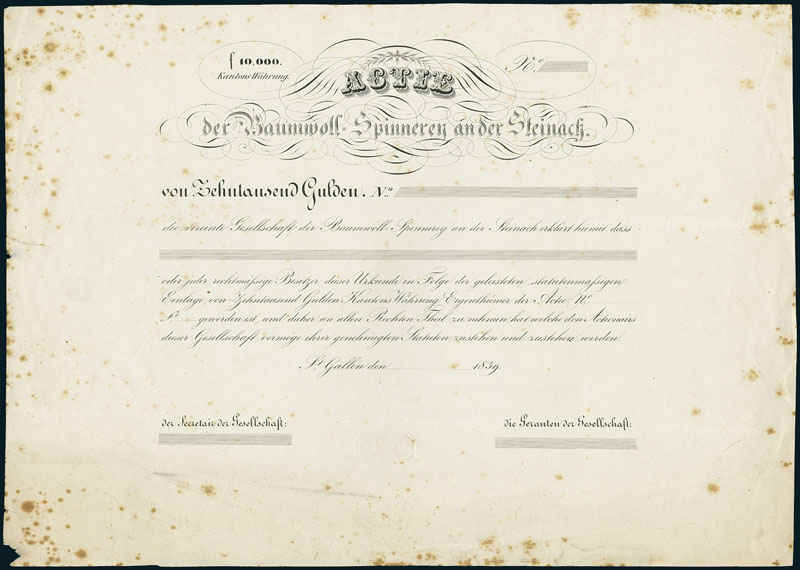 Baumwoll-Spinnerey an der Steinach. Aktie über 10'000 Gulden Kantons Währung. St. Gallen, 1839. Blankett. Diese Spinnerei befand sich im St.Galler Stadtteil Sankt Georgen. Früher Titel im Grossformat. Stockfleckig. VF.