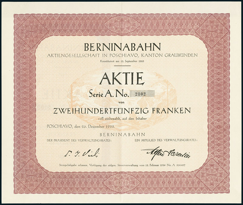 Berninabahn. Aktie Fr. 250, Serie A. Poschiavo, 20. Dezember 1933. Nr. 2102. Die Berninabahn ist eine eingleisige, meterspurige Eisenbahnstrecke der Rhätischen Bahn (RhB). Sie wurde nach der Fertigstellung der Albulaline 1905 mit dem Ziel gegründet, St. Moritz über den Berninapass mit Tirano zu verbinden. Die Eröffnung erfolgte ab 1908 in mehreren Teilabschnitten. Ursprünglich war die Berninabahn nur für den Sommerbetrieb vorgesehen. 1913/14 wurde jedoch auch der Winterbetrieb aufgenommen. Aufgrund der schwierigen finanziellen Lage musste sie 1943 von der Rhätischen Bahn übernommen werden. Sie gilt als höchste Adhäsionsbahn der Alpen und – mit bis zu sieben Prozent Neigung – als eine der Steilsten der Welt. 2008 wurde die Berninabahn gemeinsam mit der Albulabahn in die Liste des UNESCO-Weltkulturerbes aufgenommen. EF.