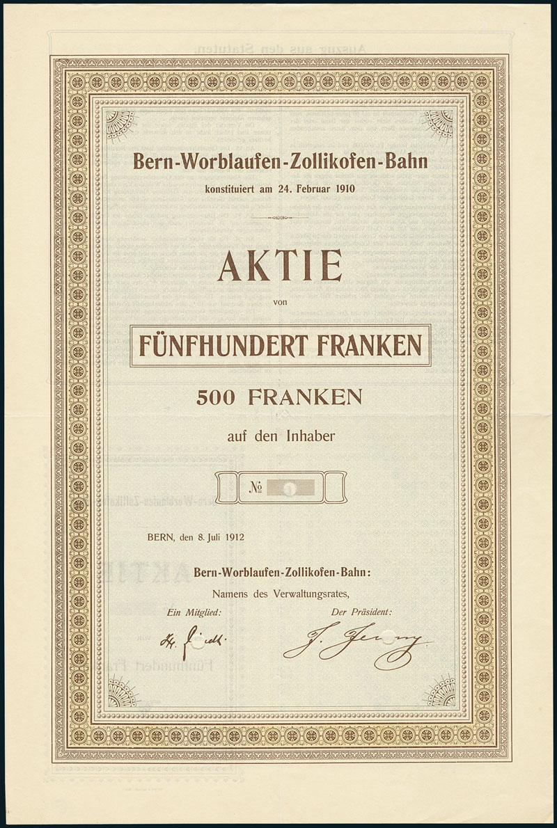 Bern-Worblaufen-Zollikofen-Bahn. Aktie über 500 Franken. Bern, 8. Juli 1912. Blankette. Im April 1909 bildet sich ein Initiativkomitee für den Bau einer Schmalspur-Strassenbahn Zollikofen-Tiefenaubrücke-Bern, dem im selben Jahr die Konzession erteilt wurde. Am 13. Juli 1912 nimmt die Bahn ihren Betrieb auf der 8 km langen Strassenstrecke bis zum Tierspital auf. 1917 verkehrte der ersten Zug bis Bern-Bahnhof. Heute Regionalverkehr Bern-Solothurn. Druckunterschriften. Es wurden 1'320 Aktien emittiert. Dieser Titel ist wahrscheinlich ein Einzelstück. EF.