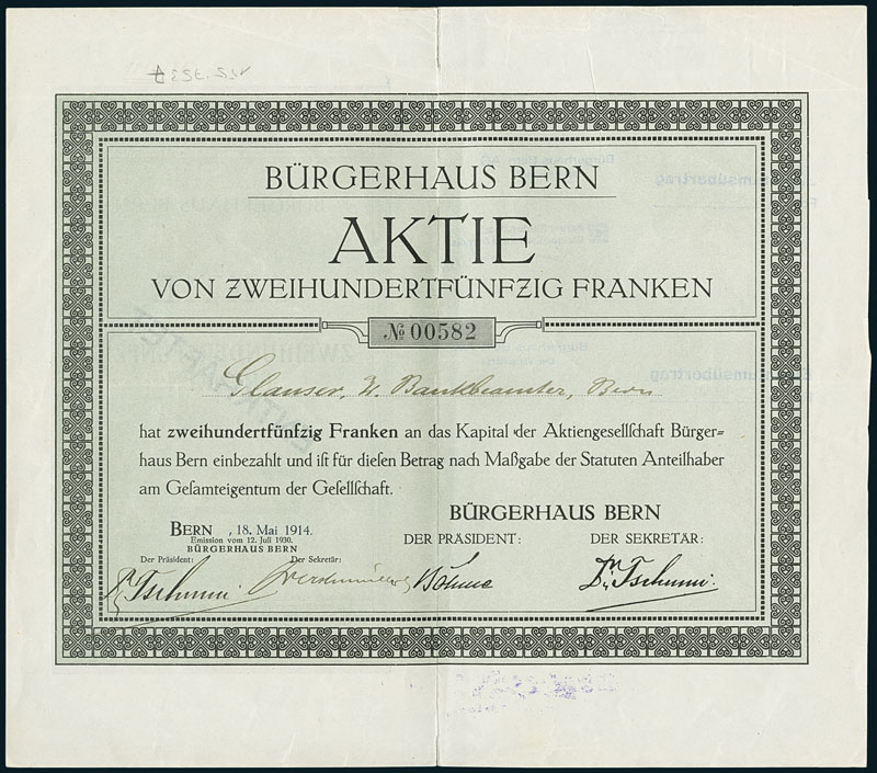 Bürgerhaus Bern. Lot 2 verschiedene Stücke: a) Aktie Fr. 250, 18. Mai 1914 b) Aktie Fr. 27. Mai 1963. Nr. 00582 / 1852. Beide Stücke mit Couponbögen. EF.