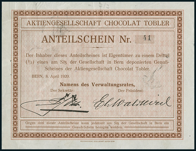 Chocolat Tobler Bern. Anteilschein. Bern, 8. April 1920. Nr. 41. Starke Gebrauchsspuren. 1867 eröffnete der Confiseur Jean Tobler in Bern sein erstes Schokoladengeschäft, die Confiserie Spéciale. 1899 gründet er zusammen mit seinen Söhnen Theodor und Emil eine eigene Schokoladenfabrik, die “Fabrique Chocolat Berne, Tobler & Cie”. Im Jahr 1908 kreiert Theodor zusammen mit seinem Cousin Emil Baumann die erste Toblerone. Diese bis heute wohl weltweit bekannteste Schokolade kombiniert den Namen Tobler und das italienische «Torrone», eine Honig-Mandel-Nougat Süssigkeit. 1909 wurde diese als erste Milchschokolade überhaupt patentgeschützt. 1982 gelangt die Gesellschaft zu Jacobs Suchard und ist seit 1990 Teil von Philip Morris / Mondelez. Der Inhaber dieses Anteilscheines ist Eigentümer zu einem Drittel eines Genuss-Scheines. Kleinformatiger, seltener Titel. VF.