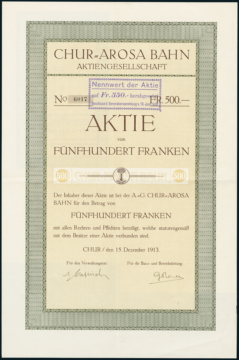 Chur-Arosa Bahn. Aktie, Fr. 500. Chur, 15. Dezember 1913. Die meterspurige Bahnstrecke Chur–Arosa wurde 1914 errichtet, um den Graubündner Kantonshauptort Chur mit dem Kurort Arosa zu verbinden. Seit 1942 ist sie in das Netz der Rhätischen Bahn integriert. Die Chur-Arosa Bahn AG wurde 1912 mit einem Aktienkapital von Fr. 7,6 Mio. gegründet. Der Kanton Graubünden war von Beginn an Mehrheitsaktionär. Das instabile Gelände bereitete der Bauleitung grosse Probleme. Trotzdem konnte die Linie schon nach nur zwei Jahren Bauzeit im Jahr 1914 eröffnet werden. EF.