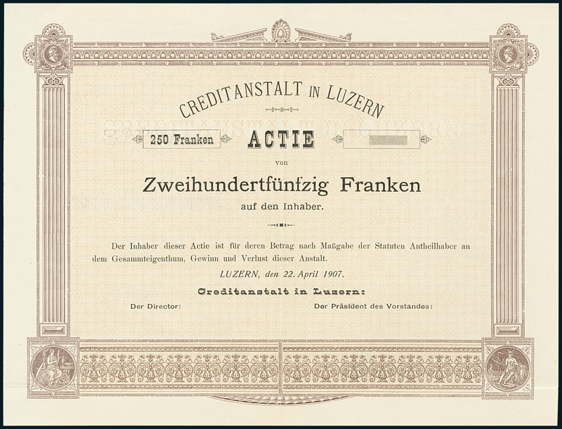 Creditanstalt in Luzern. Aktie über 250 Franken. Luzern, 22. April 1907. Blankette. Gründung 1872 durch die Basler Handelsbank und die Schweizerische Vereinsbank aus Bern. 1944 wurde sie durch die Schweizerische Bankgesellschaft, heutige UBS, übernommen. Dekorative Umrandung mit Vignetten. EF.
