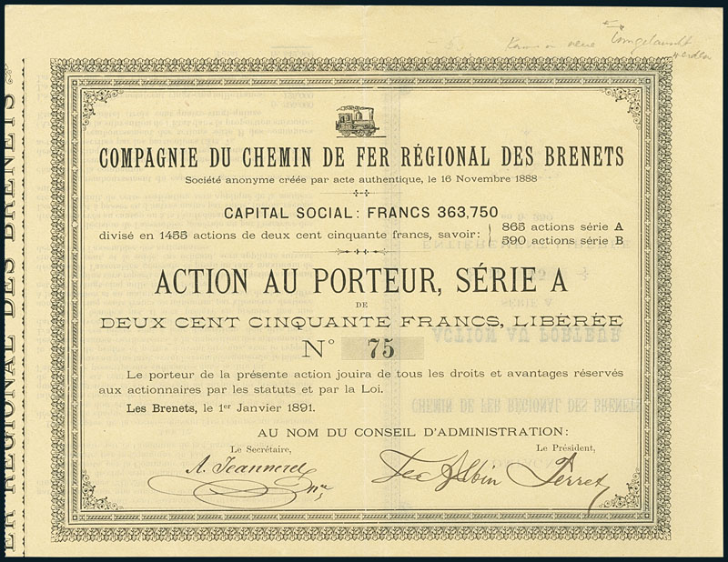 Régional des Brenets, Compagnie du Chemin de fer. Aktie Serie A über 250 Franken. Les Brenets, 1. Januar 1891. Hellbraun. Nr. 75. Im Jahr 1888 wurde die Konzession für die Bahn Les Brenets-Le Locle erteilt, ein Jahr später der Betrieb aufgenommen. Im Jahre 1947 erfolgte die Fusion mit der Chemin de fer Ponts-Sagne-Chaux-de-Fonds zur heute noch bestehenden 'Chemins de fer des Montagnes neuchâteloises'. 1950 wurde die Strecke elektrifiziert. Kleinformatiger Titel mit Abbildung einer Dampflok. VF.