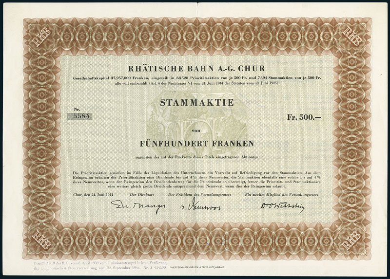 Rhätische Bahn AG. Stammaktie, Fr. 500. Chur, 24. Juni 1944. Nr. 5584. Das Stück ist zediert. EF