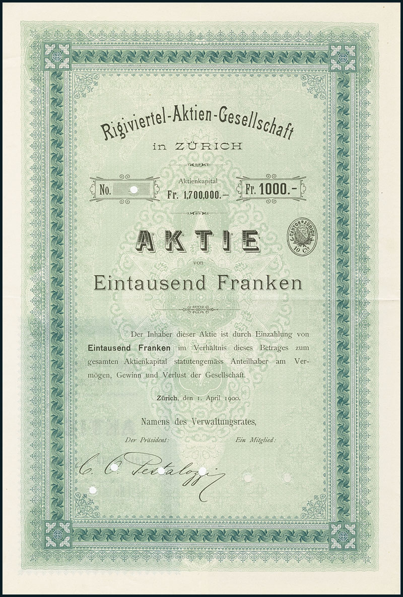 Rigiviertel-Aktien-Gesellschaft. Aktie über 1'000 Franken. Zürich, 1. April 1900. Grün. Blankett. Die Gesellschaft handelte mit Liegenschaften im Rigiviertel von Zürich und war Nutzniesserin der Seilbahn. EF.