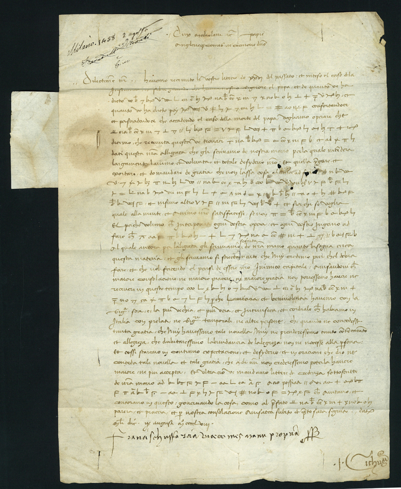 FRANCESCO MARIA SFORZA, il primo duca di Milano, che acquiscì il titolo ducale grazie al suo matrimonio con Bianca Maria Visconti, originandosi così il ramo principale della famiglia. CICCO SIMONETTA, cancelliere di Francesco Sforza, consigliere e segretario dei duchi Francesco e Galeazzo; all'uccisione di Galeazzo nel 1476, salvò il dominio sforzesco per il piccolo Gian Galeazzo e divenne il vero padrone dello stato, fino a quando Bona di Savoia provoca un allontanamento dal Simonetta in favore del cognato Ludovico il Moro. Lettera da Milano del 2 agosto 1458 da Francesco Maria Sforza, scritta dal segretario Cicco Simonetta, “all’oratore nostro ap Supremo Pontefice” Ottone Del Carretto a Roma. In quei giorni il Papa Callisto III era in fin di vita (morirà il 6 agosto), e il Duca di Milano si premura di far sapere al suo oratore “...et persuadendo che accadendo el caso della morte del Papa doghiamo operare che...” (seguono istruzioni in codice). L'orientamento di Milano riguardo all'elezione del nuovo pontefice era senza esitazioni in favore del card. Domenico Capranica, che si riteneva estremamente favorevole allo Sforza e con il quale il Del Carretto, per incarico del duca, aveva mantenuto relazioni amichevoli e deferenti. La lettera reca la firma di Francesco Maria Sforza e di Cicco Simonetta; sigillo al verso con lo stemma del Ducato di Milano. Alcune pieghe senza importanza, usuali in documenti di questo periodo. Rarissima e di grande interesse storico, con la presenza di due personalità di grande importanza nella storia milanese ed italiana.