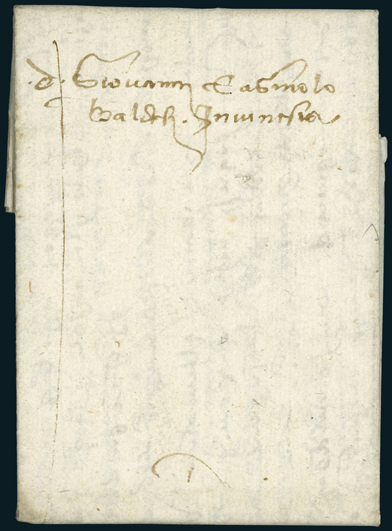 1459, lettera da Mantova del 13 ottobre indirizzata ai Fratelli Giovanni e Angelo Baldesi, mercanti di stoffe a Venezia, con segno "1)" ed indicazione in basso che la tariffa per il trasporto fu pagata. La lettera fu recapitata il 25 ottobre, come da annotazione al verso.