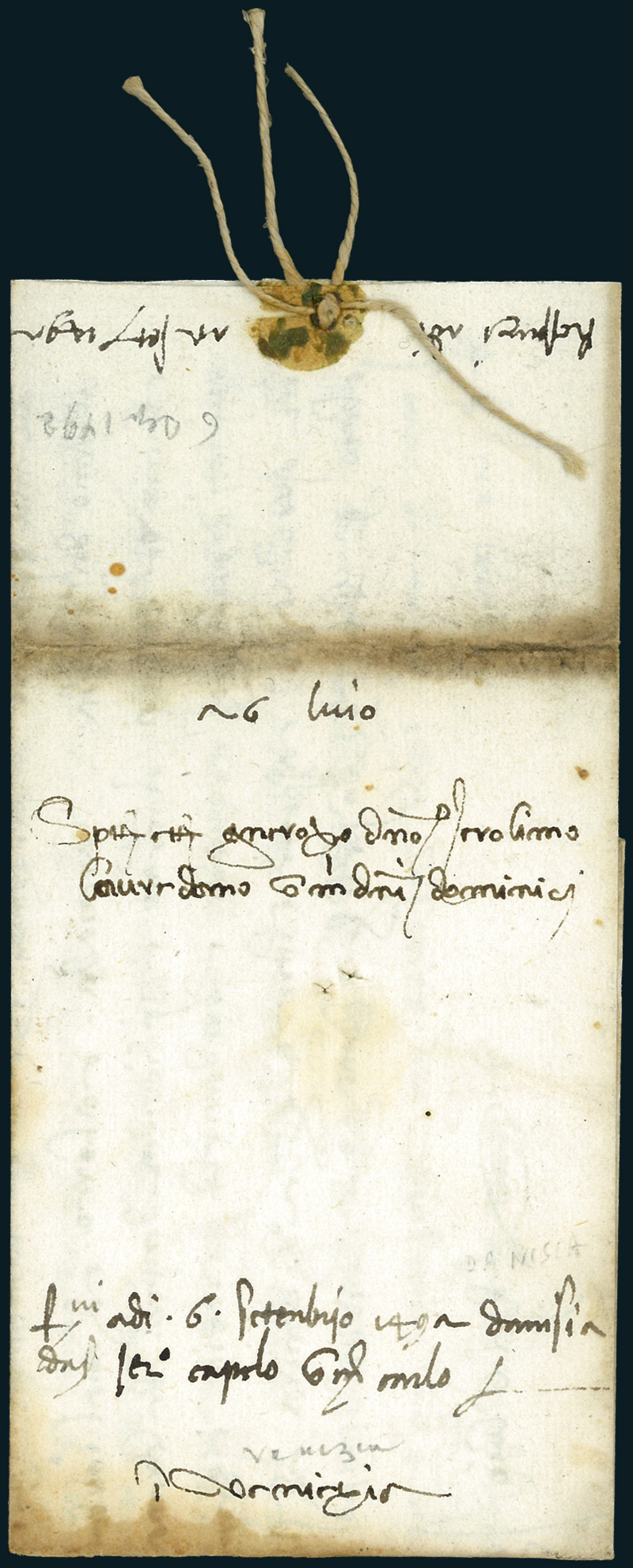 1492, lettera da Reggio (?) del 6 luglio per Venezia, sigillata con cordino. Nel testo si scrive di armate, bombardamenti e di denaro per i soldati. Alcune leggere ossidazioni e carta in parte aperta in basso, per causa della piega originale. Rara e molto interessante.