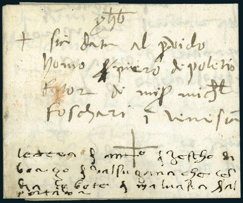 1495, lettera da Borgo Valsugana per Venezia, recante segni di croce a significare il porto pagato (franchigia o franca?).