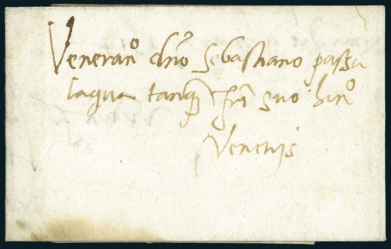 1514, piccolla (7,6 x 4,9 cm.) lettera da Roma del 9 marzo per Venezia, indirizzata al notaio Sebastiano Passalacqua. Sigillo al verso con raffigurati una coppia di delfini.