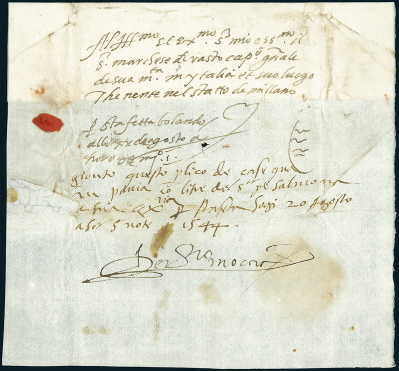 1544, bolgetta da Milano del 20 agosto per Pavia, indirizzata al Governatore di Milano Alfonso D'Avalos, Duca di Milano dal 1538. Trasportata per mezzo dei corrieri di Simone Tasso (recatosi a Milano nel 1523 per ordine di Carlo V al fine di dirigere le poste), con manoscritto "p. stafetta volando" ed indicazione grafica per "Cito", ripetuta quattro volte, a destra. Molto rara.