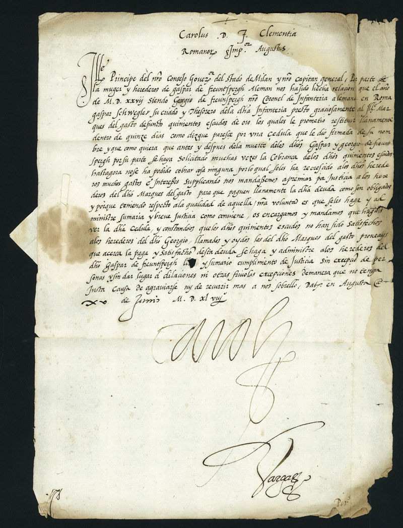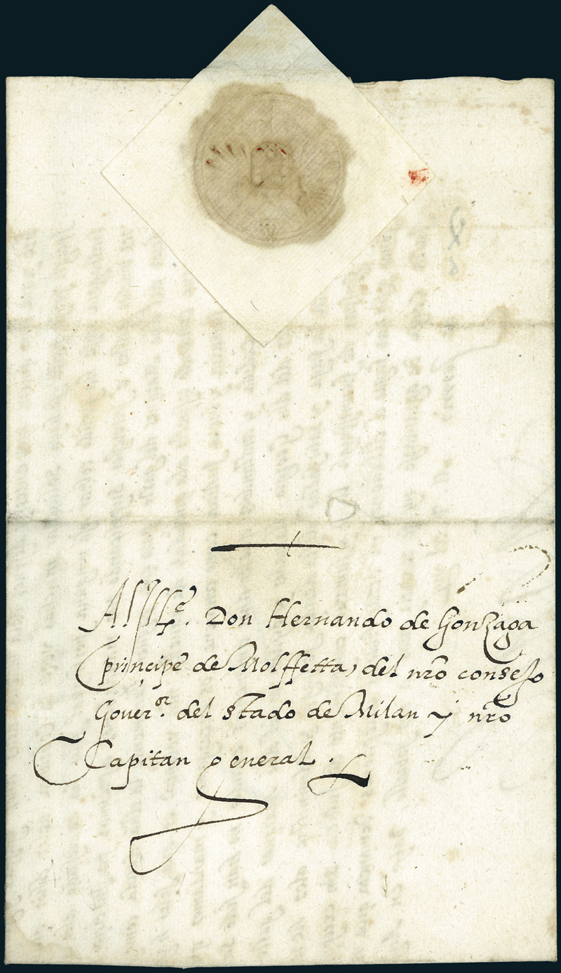 CARLO V, (Carlo I come re di Spagna), Imperatore del Sacro Romano Impero. Lettera datata in Augusta (Augsburg, Germania) il 15 giugno 1548, da parte di Carlo V con la sua firma autografa "Carol", indirizzata al Duca di Milano Ferdinando di Gonzaga Principe di Molfetta (Governatore dello Stato di Milano dal 1546 al 1554). Al verso sigillo imperiale di Carlo V. Piccola macchia del tempo in alto a destra, senza importanza. Molto rara e bella.