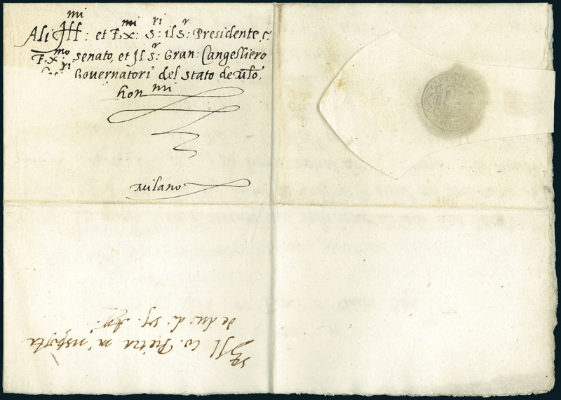 1554, lettera da Soncino dell’8 agosto per i Governatori di Milano, a firma di Carlo Pietra, nella quale scrive: “In questa hora o ricevuto dal postilione di Lodi due littere della Ex.ia v. di VII del passato in una de qual me ordinano ch’io faccia allegria per la bona nona de la vitoria si a avuto contra Pietro Strozzo, la qual cosa no manchero di far il debito...Questi soldati stano tutti mal contenti vedendo il tardar de la paga e supplico le Ex.me v. si degnino far expedir il mio, acio che questi soldati servino allegramente, et co questo fine. Humilmente gli bascio le mani, da Soncino ali VIII di agosto 1554". La vittoria a cui si riferisce la lettera è la cruentissima combattuta nei pressi del villaggio del Pozzo, il 2.8.1554 tra l'esercito franco-senese, comandato da Pietro Strozzi, contro l'esercito ispano-mediceo assoldato dal duca di Firenze (Cosimo I), comandato da Gian Giacomo Medici; l'esito sfavorevole ai Senesi segnò il declino della Repubblica di Siena. Straordinario documento storico.