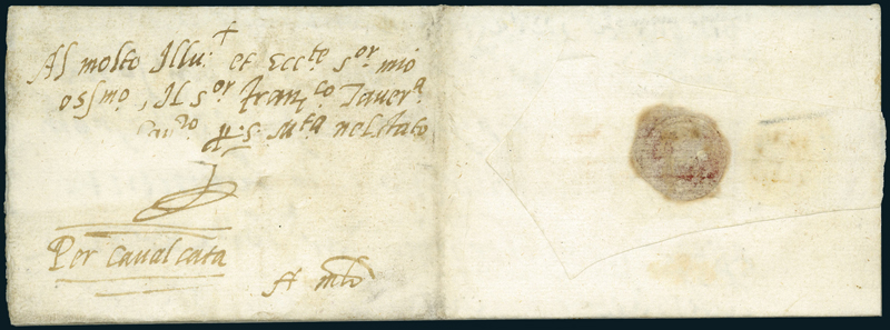 1555, due lettere scritte dal Cicogna da Novara, “Commissario generale delle tasse, et Collaterale generale nel Stato di Milano, et Cesareo Gubernator in Novara et Novarese”, dirette a Francesco Taverna, Presidente del Senato e Gran Cancelliere dei Regi Governatori dello Stato di Milano per le materie politiche ed economiche. Sigillo della famiglia Cicogna al verso di ogni lettera, di cui una con indicazioni “Per Cavalcata” sul frontespizio. Molto rare.
