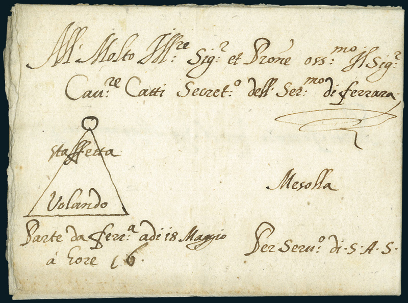 1594, lettera da Ferrara del 18 maggio per Mesola, indirizzata al Cancelliere Ercole Catti, segretario ducale di Alfonso II d’Este. Nel testo: “... di commissione dell’Ill.mo Sign. Imola si spedisce la presente staffetta con lettere per S.S. Serenissima di Firenze, et altre, et anco per V.S. Ill.re et per diversi della Corte con un fagotino per l’Ill.mo Sig.r Co’ Scipion Gilioli che il tutto piacerà a Lei far Bene Recapitare, et per finire le bascio le mane Pregandoli da nos Sig.re ogni suo desiato Contento. Di Ferrara dì 18 maggio 1594. Aff.mo Ser.re Paris Ferrari per il Sig.r Magnanini.” Sul frontespizio segno di staffetta e “volando”, e manoscritto “Parte da Ferrara adì 18 maggio a’ hore 16”. Molto rara ed interessante.