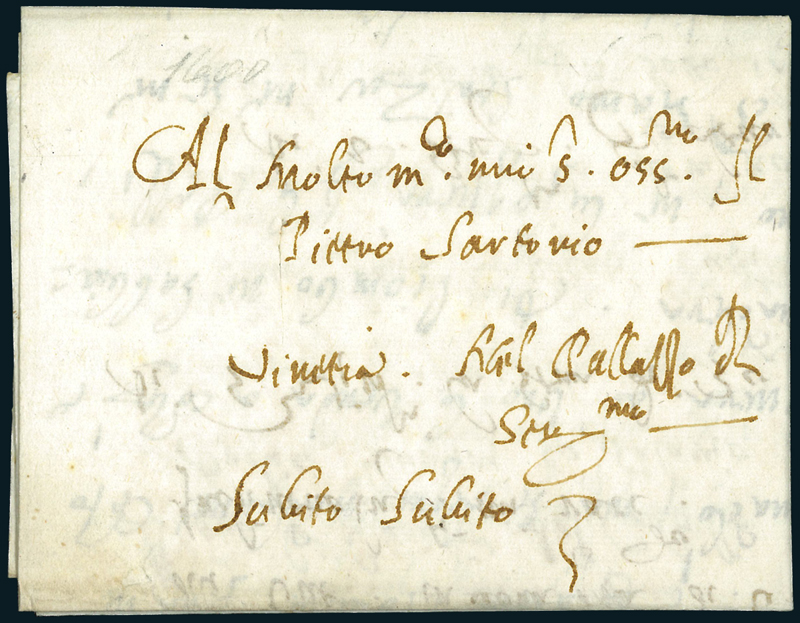 1600, lettera da Sanvincenti (Croazia) per Venezia, con indicazioni “Col Battello", "Subito, Subito" e segno di pagamento. Nel testo, molto interessante, il mittente informa che per la difesa “a far da guardia del Castello tenimo ordinariamente, giorno e notte, dodici uomini co’ salario...”. Molto interessante e rara.