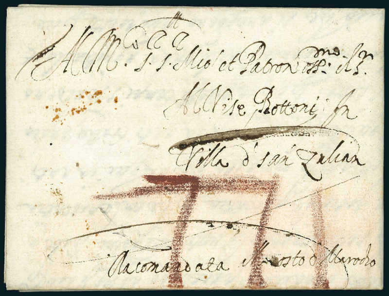 1631, lettera da Venezia con manoscritto in basso "Racomandata" e tassazione in sanguigna. Rara.
