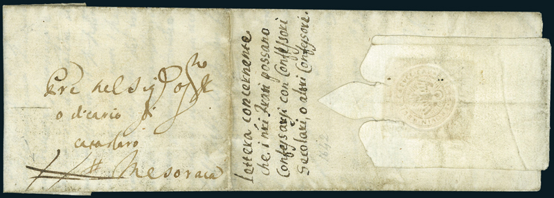 1636-42, due lettere, una per Mesoraca (Napoli) scritta da un frate cappuccino con testo di carattere religioso, segno indicante “per cavalcata” e sigillo di chiusura che raffigura un angelo sulla nizza completa; l'altra lettera du indirizzata da Napoli per Genova, giunta il 28 luglio 1636, scritta da Cornelio Spinola, console genovese a Napoli presso la corte del vicereame spagnolo.