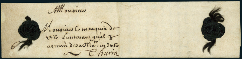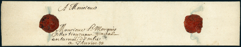 1636-59, insieme di tre lettere dalla Francia, sigillate con traccce di nastro (come d'abitudine in quel paese all'epoca), la prima da Avignone del 1636 per Pont St. Esprit; le altre due (1657-59) indirizzate al luogotenente generale dell'armata francese in Italia Guillaume de Montboissier Beaufort-Canilhac, entrambe per Torino, di cui una con testo interessante ove si accenna alla Guerra Franco-Spagnola (1635-1659).