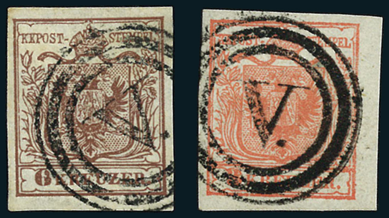 1850, insieme composto da una lettera affrancata con 15 c. (3), un frammento con coppia del 15 c. (3), più tre francobolli sciolti compresi un 45 c. (10), un 3 kr. ed un 6 kr. dell'Austria, tutti annullati con il muto di Venezia.