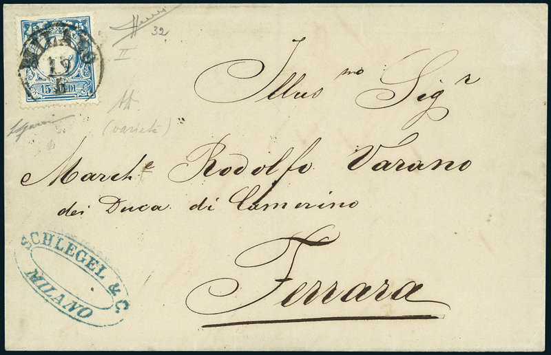 1859, lettera da Milano del 19 maggio per Ferrara, affrancata con un 15 s. azzurro II tipo (32), recante stampa evanescente intorno alla effigie di Francesco Giuseppe. Rarissima varietà di effetto visivo. Cert. Sorani, firmata A. Diena e Gazzi.