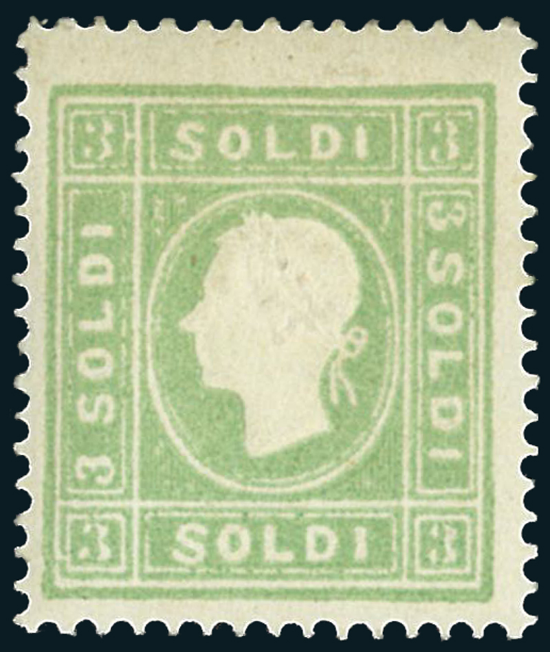 1862, 3 s. verde giallo (35), nuovo con gomma originale, impressione in rilievo eccellente. Cert. Sorani, firmato A. Diena.