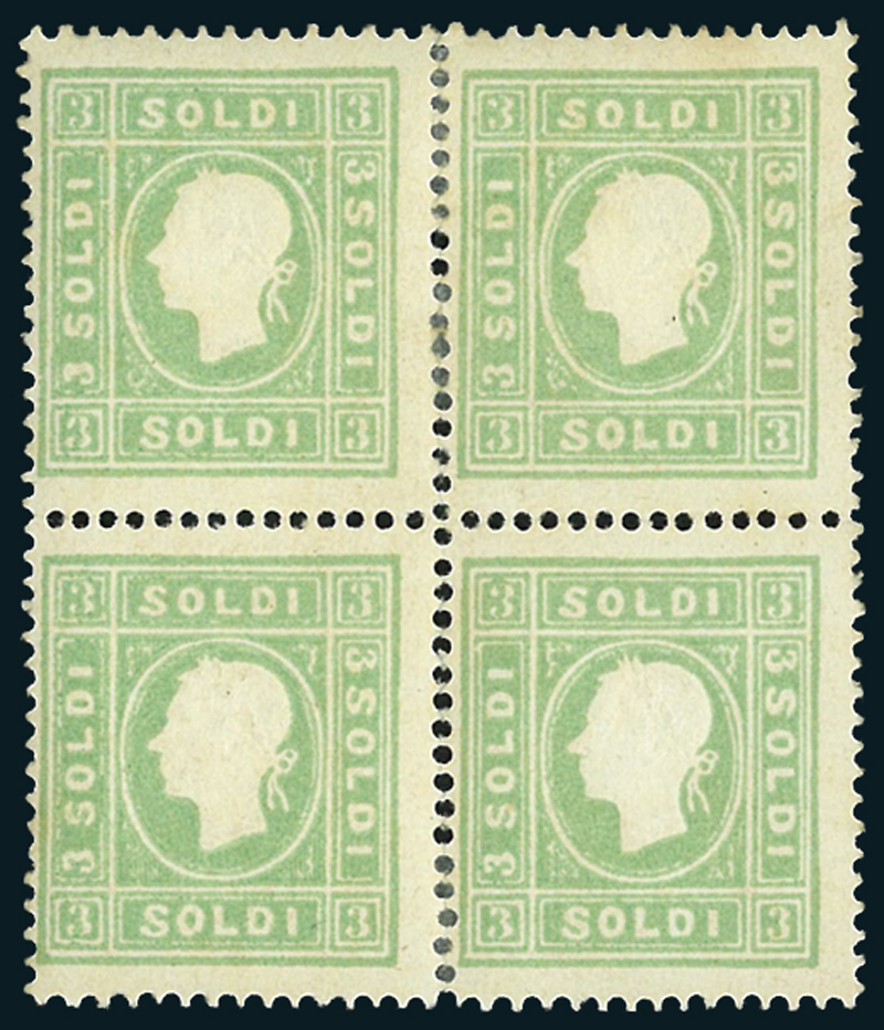 1862, 3 s. verde giallo (35), blocco di quattro, nuovo con gomma originale. Gran parte della dentellatura centrale è aperta e rinforzata con linguella al verso. Cert. A. Diena e Sorani.