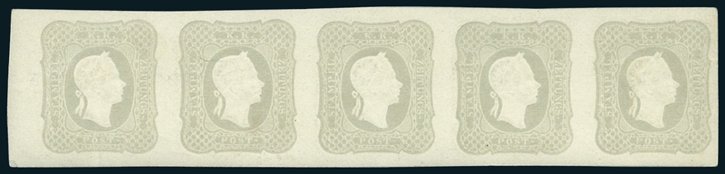 1861, francobolli per giornali, (1,05 s.) grigio chiaro, striscia di cinque con bordo di foglio a sinistra, nuova con gomma originale, ben marginata e con rilievo ben marcato. Quasi impercettibile piega verticale a sinistra. Cert. Sorani, firmato A. Diena e Fiecchi.