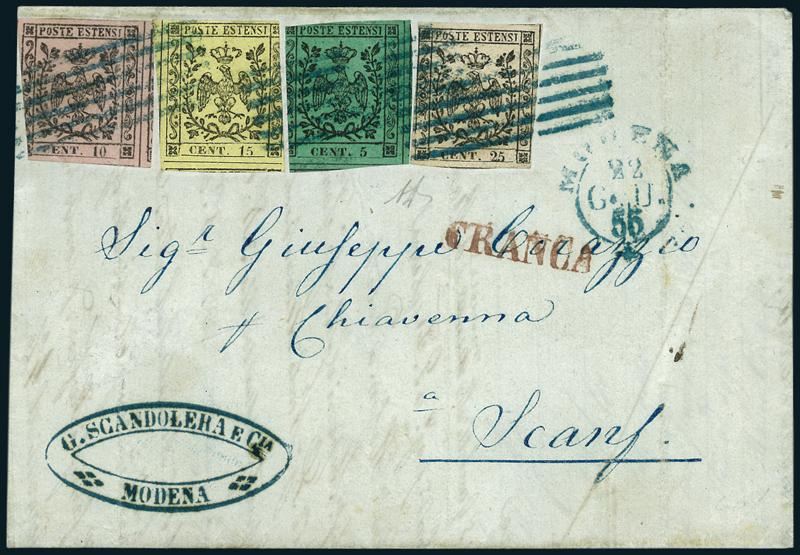 1852, lettera da Modena del 22 giugno 1855 per la Svizzera, affrancata per il porto semplice a meno di 75 km. del confine austriaco, con 5 c. verde (1), 10 c. rosa chiaro (2), 15 c. giallo (3) e 25 c. camoscio chiaro (4), annullato con bollo a sei sbarre in azzurro, con a lato timbro "Franca" in rosso applicato in transito a Milano. Alcuni margini corti e leggera piega verticale a sinistra. Le affrancature quadricolori sono rarissime. Firmata A. Diena.