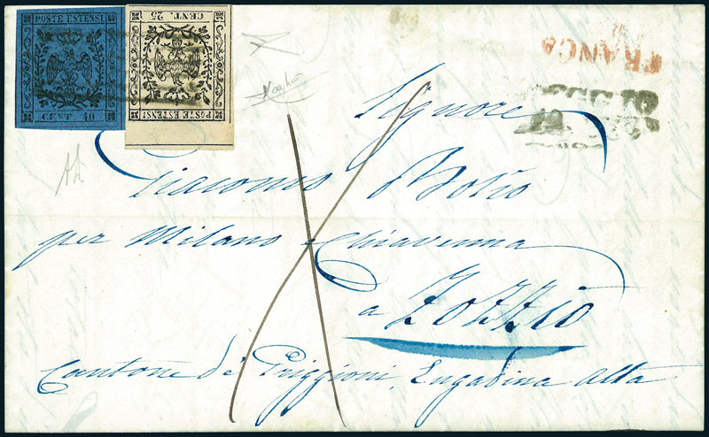 1852, lettera da Reggio del 12 luglio 1854 per Zozzio (Svizzera), affrancata con 25 c. camoscio chiaro (4) con spettacolare grande parte di interspazio di gruppo in alto, e 40 c. azzurro scuro (6), entrambi annullati con bollo a sei sbarre, con pagamento del primo porto di lettera semplice per una destinazione svizzera localizzata ad oltre 75 km dal confine austriaco, con timbro ''Franca'' in rosso applicato al confine lombardo-austriaco. Uno splendido esempio di questa rara affrancatura per la Svizzera. Cert. Bottacchi, firmato A. Diena e Raybaudi.