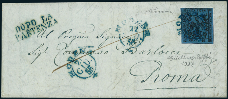 1854, lettera da Modena del 21 giugno 1855 per Roma, con bel esemplare del 40 c. azzurro scuro (10), annullato con bollo datario a capello, ripetuto due volte a lato, recante anche il timbro ''Dopo La/Partenza'' a sinistra, tutti in azzurro. Un esempio molto desiderabile di questa singola affrancatura. Firmato Vaccari e G. Bolaffi.