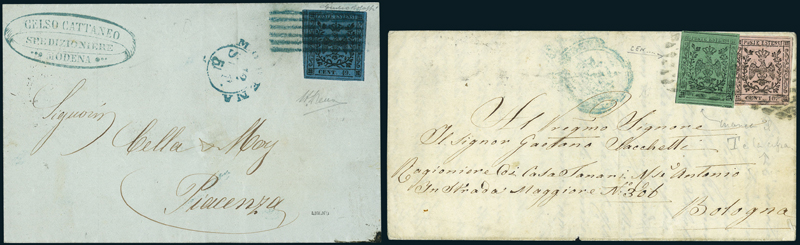 1852-54, insieme composto da tre lettere con francobolli recanti errori tipografici o varietà, con un 5 c. in affr. singola recante una piega prima della stampa, affr. singola di un 40 c. recante "CENT. 49", "9" invece di "0" (10a) accompagnata da cert. di G. Bolaffi, ed affr. composta da un 10 c. ed un 5 c. con punto dopo le cifre con il 5 c. mostrante "CEN" senza la "T" e con la cifra mancante. Insieme raro.