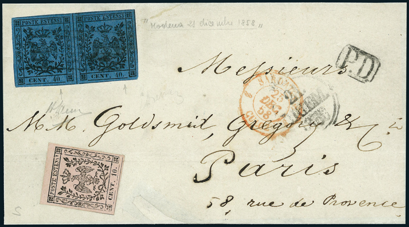 1854-57, lettera da Modena del 21 dicembre 1858 per Parigi, affrancata per il primo porto con la Francia via Sardegna con 10 c. rosa (9) e coppia del 40 c. azzurro scuro, senza e con punto dopo ''40'' (10i), la varietà proveniente dalla posizione 144 del foglio, annullati a sei sbarre, con a lato timbro rosso di entrata in Francia. Affrancatura rara. Da esaminare. Cert. A. Diena.
